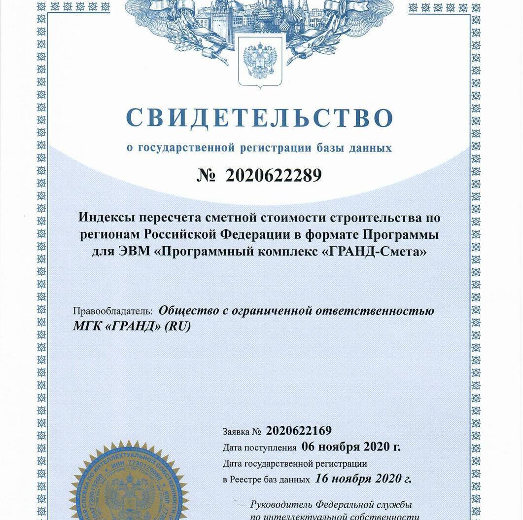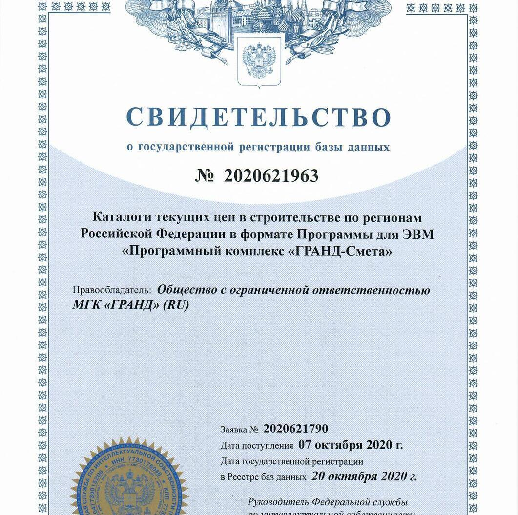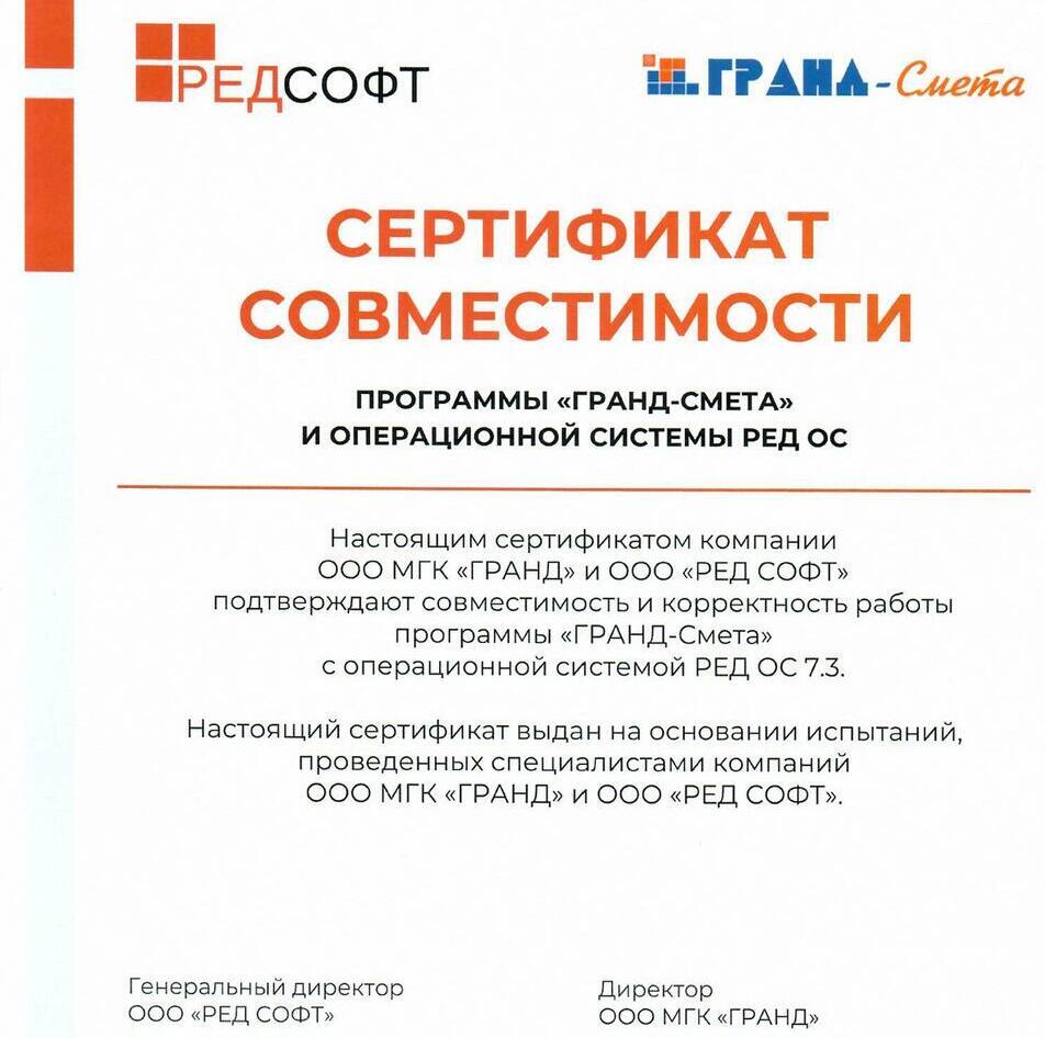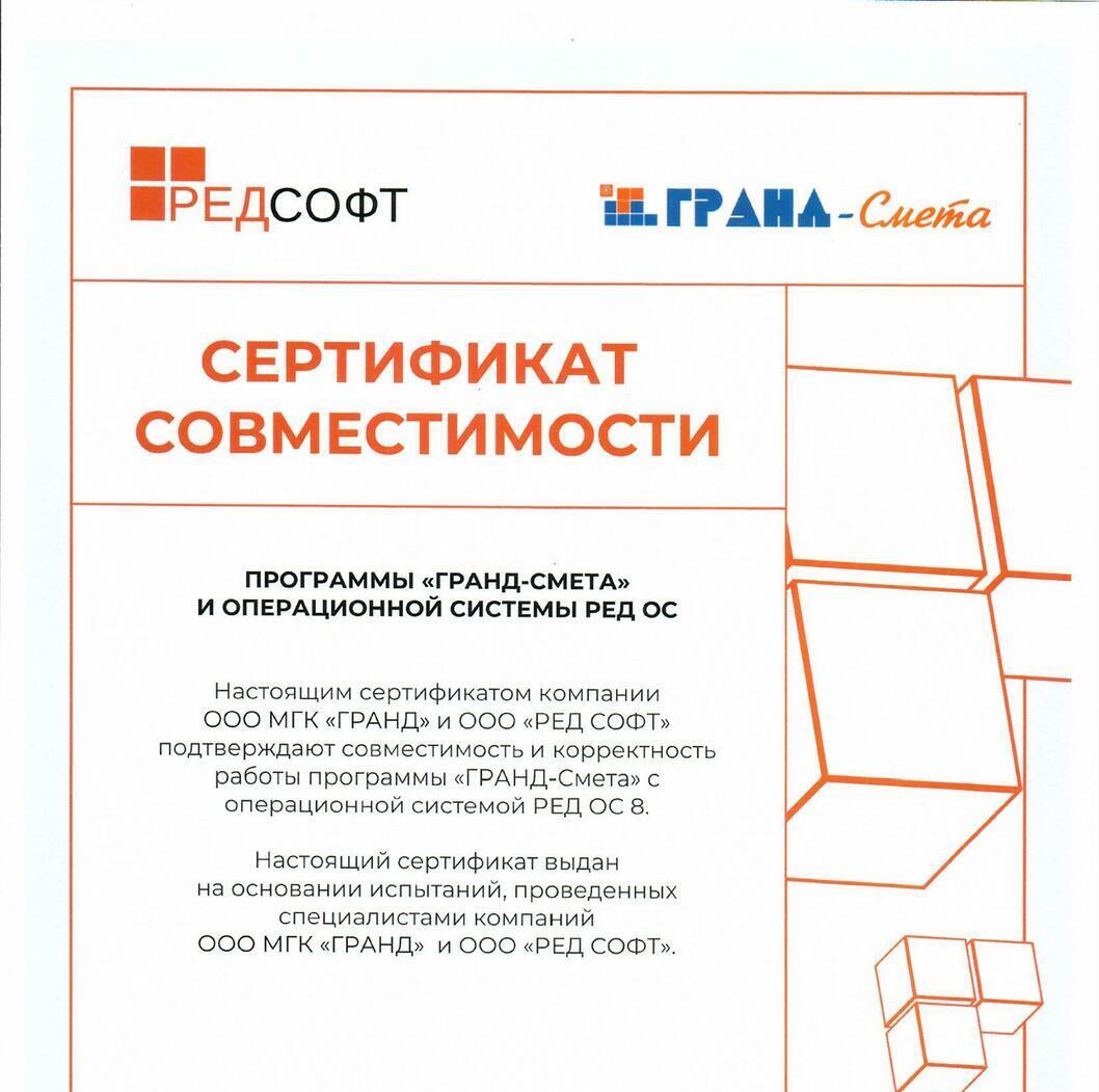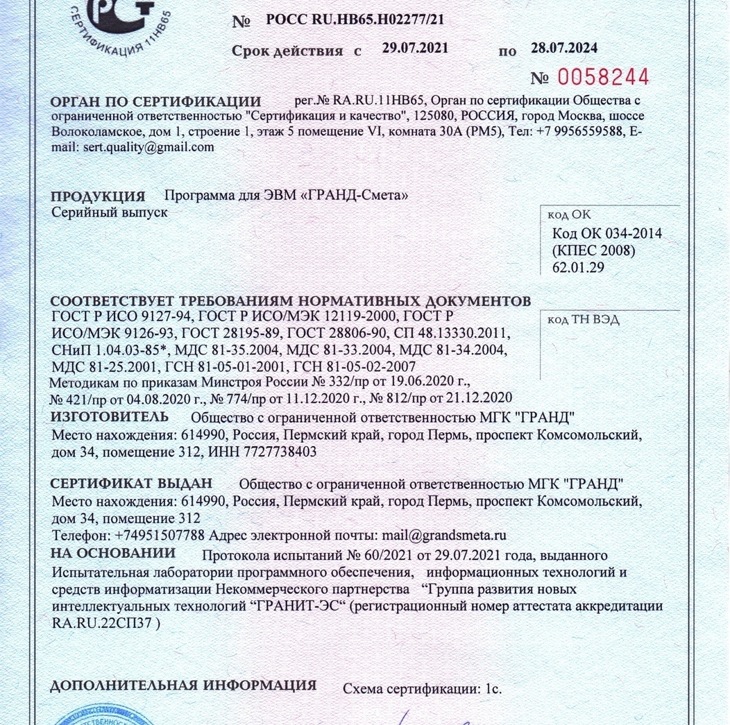 Программа прошла сертификацию в системе ГОСТ Р Федерального агентства по техническому регулированию и метрологии, что подтверждается сертификатом № РОСС RU.HB65.H02277/21 от 29.07.2021 г. Сертификат подтверждает, что программа «ГРАНД-Смета» соответствует требованиям нормативных документов, указанных в приложении к сертификату, в том числе требованиям действующей Методики определения сметной стоимости строительства, реконструкции, капитального ремонта, сноса объектов капитального строительства, работ по сохранению объектов культурного наследия (памятников истории и культуры) народов Российской Федерации на территории Российской Федерации, утвержденной Приказом Министерства строительства и жилищно-коммунального хозяйства Российской Федерации от 4 августа 2020 г. № 421/пр.