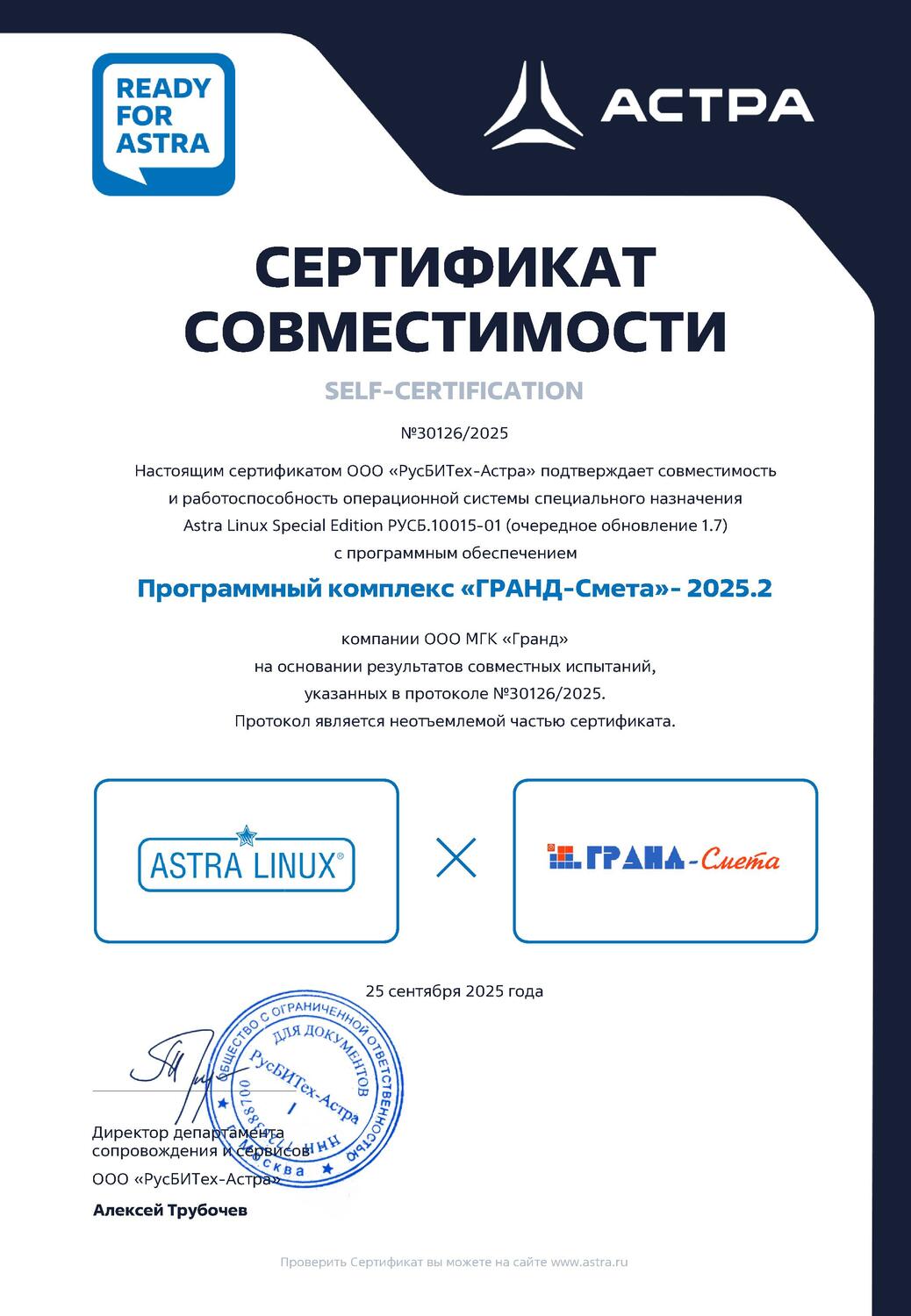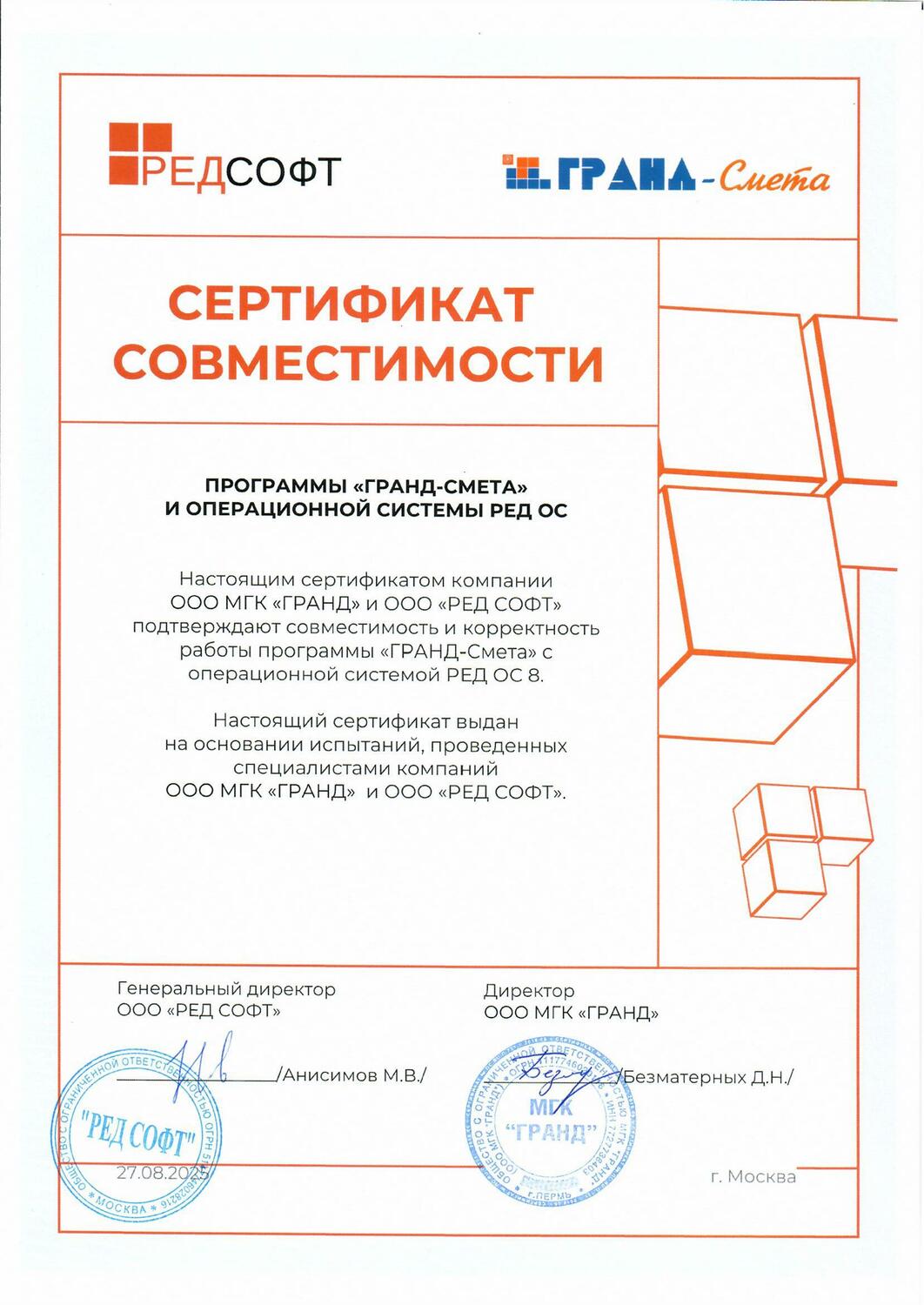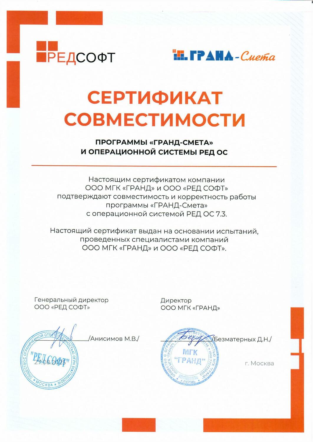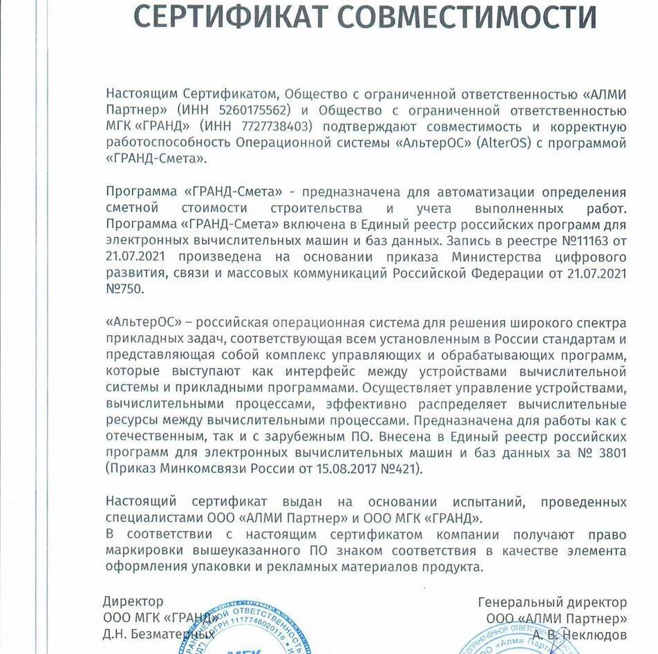 Программа прошла сертификацию в системе ГОСТ Р Федерального агентства по техническому регулированию и метрологии, что подтверждается сертификатом № РОСС RU.HB65.H02277/21 от 29.07.2021 г. Сертификат подтверждает, что программа «ГРАНД-Смета» соответствует требованиям нормативных документов, указанных в приложении к сертификату, в том числе требованиям действующей Методики определения сметной стоимости строительства, реконструкции, капитального ремонта, сноса объектов капитального строительства, работ по сохранению объектов культурного наследия (памятников истории и культуры) народов Российской Федерации на территории Российской Федерации, утвержденной Приказом Министерства строительства и жилищно-коммунального хозяйства Российской Федерации от 4 августа 2020 г. № 421/пр.