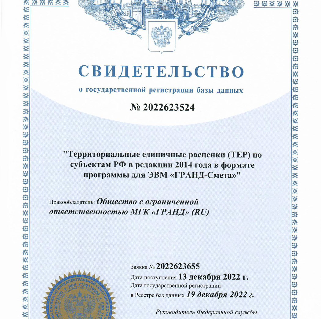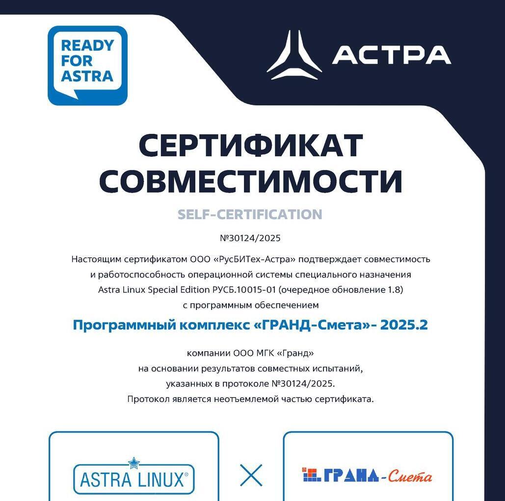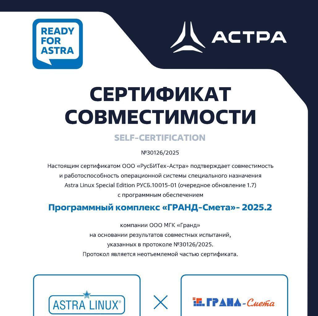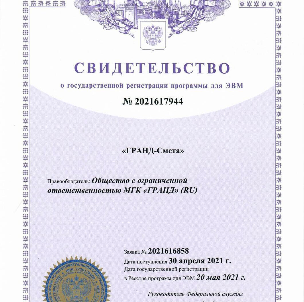Программа «ГРАНД-Смета» включена в Единый реестр российских программ для электронных вычислительных машин и баз данных. Запись в реестре №11163 от 21.07.2021 произведена на основании приказа Министерства цифрового развития, связи и массовых коммуникаций Российской Федерации от 21.07.2021 №750.