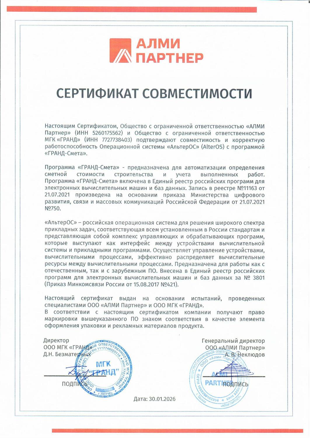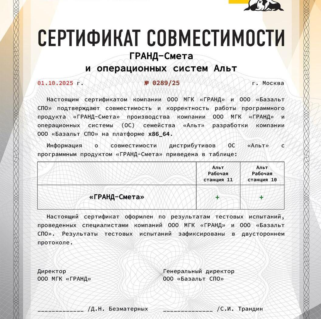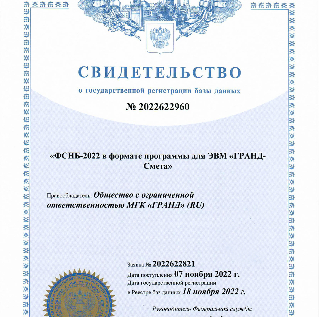 Программа «ГРАНД-Смета» включена в Единый реестр российских программ для электронных вычислительных машин и баз данных. Запись в реестре №11163 от 21.07.2021 произведена на основании приказа Министерства цифрового развития, связи и массовых коммуникаций Российской Федерации от 21.07.2021 №750.