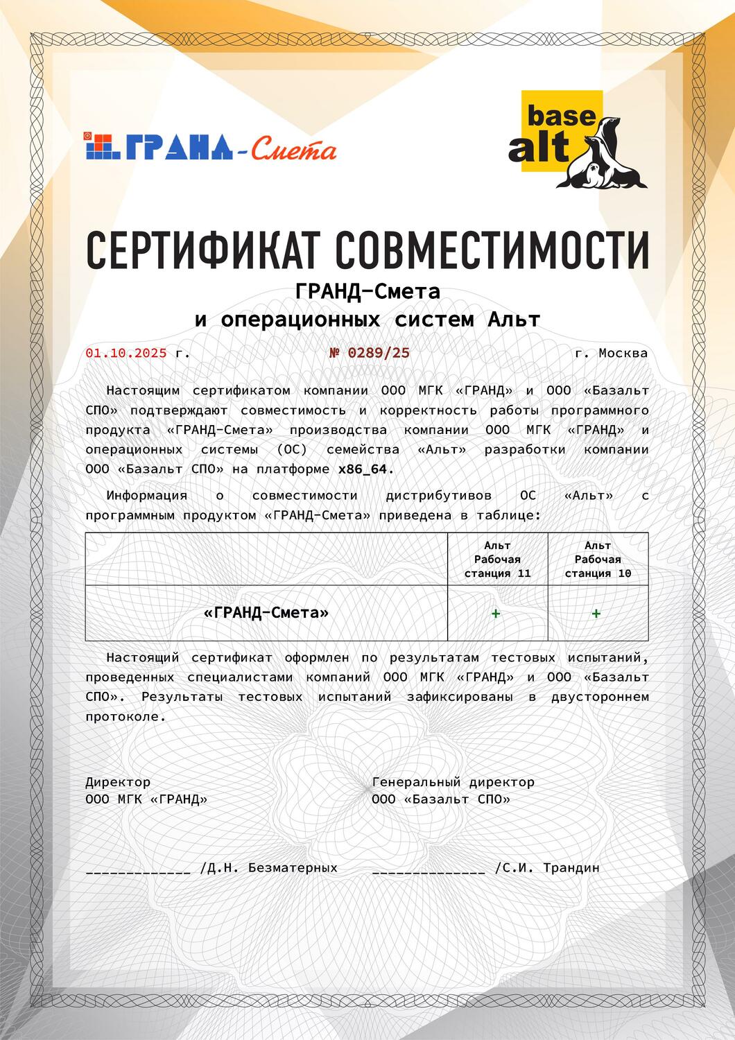 Свидетельство партнёра ООО МГК "ГРАНД"